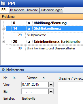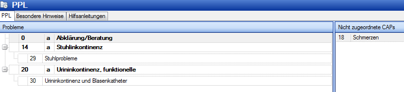Wenn Sie die Option PPL wählen, werden im oberen, linken Bereich schon erfasste Probleme angezeigt, rechts die im RAI-HC angewählten, noch nicht einem Problem zugeordneten CAPS.