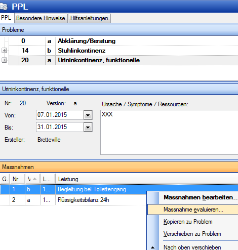 Damit nachvollziehbar bleibt, wie sich die geplanten Massnahmen verändert haben, ist es unabdingbar, dass die Beschreibungen der Massnahmen nicht gelöscht, sondern beurteilt und danach verändert werden. In einer bestehenden Pflegeplanung geschieht dies mittels Evaluation einer Massnahme oder eines Problems. Sie können sowohl einzelne Massnahmen, wie auch ganze Probleme evaluieren. Die Vorgehensweise bleibt immer dieselbe.