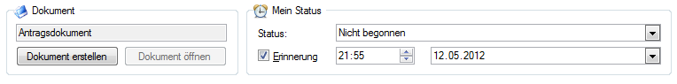 - Es ist möglich, einer Aufgabe auch ein Dokument zuzuordnen (z.B. kann der Aufgabe „Antrag erstellen" das Antragsformular zugeordnet werden). Das Dokument ist dann der Aufgabe zugewiesen und kann direkt aus dem Aufgabendialog heraus erstellt werden.