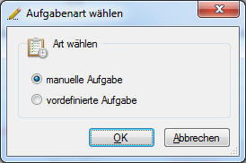 Eine im Modul Prozessunterstützung erstellte Aufgabe bzw. ein Aufgabenpaket kann auch manuell ausgelöst werden. Dies erfolgt im Modul Aufgabe durch das Erstellen einer neuen Aufgabe. Ist das Modul Prozessunterstützung lizenziert, dann wird gefragt, ob die Aufgabe manuell erstellt wird oder eine vordefinierte Aufgabe ausgelöst werden soll. Dabei kann auch ein vordefiniertes Aufgabenpaket ausgewählt werden.