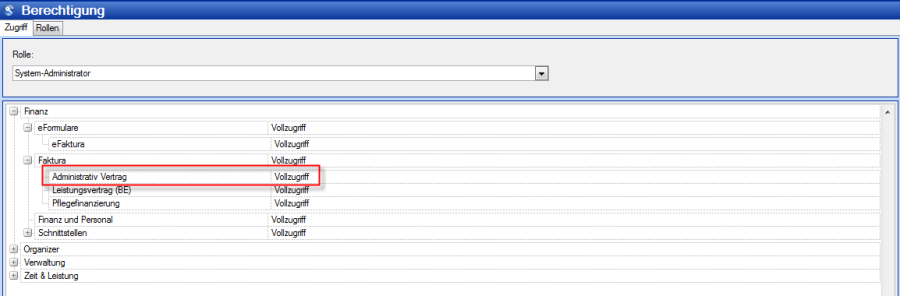 Bei allen Rollen welche Zugrif auf die Fakturierung haben muss auch der Zugriff auf den Administrativvertrag parametriert sein.