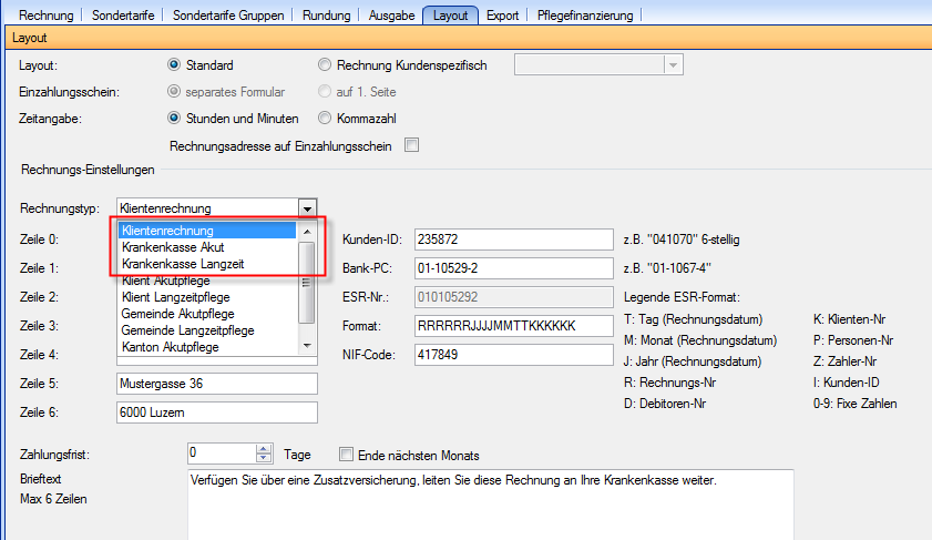 In NEXUS / SPITEX Administration unter Faktura – Layout – Rechnungs-Einstellungen müssen die Layout-Einstellungen für die Rechnung Krankenkasse Akut und Krankenkasse Langzeit gemacht werden.