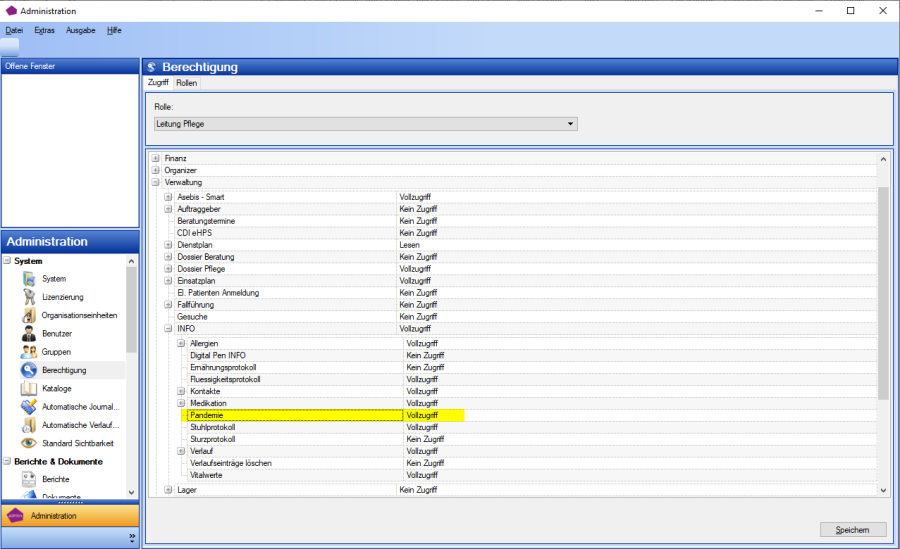 NEXUS / SPITEX NEXUS / SPITEX - Anleitungen Anleitung Modul Pandemie Current: Zugriffsrechte Zugriffsrechte Damit das Modul «Pandemie» in Dossier Pflege erscheint müssen die Rechte bei den entsprechenden Benutzerrollen gegeben werden. Das Modul befindet sich unter [Verwaltung | Info | Pandemie]. ×